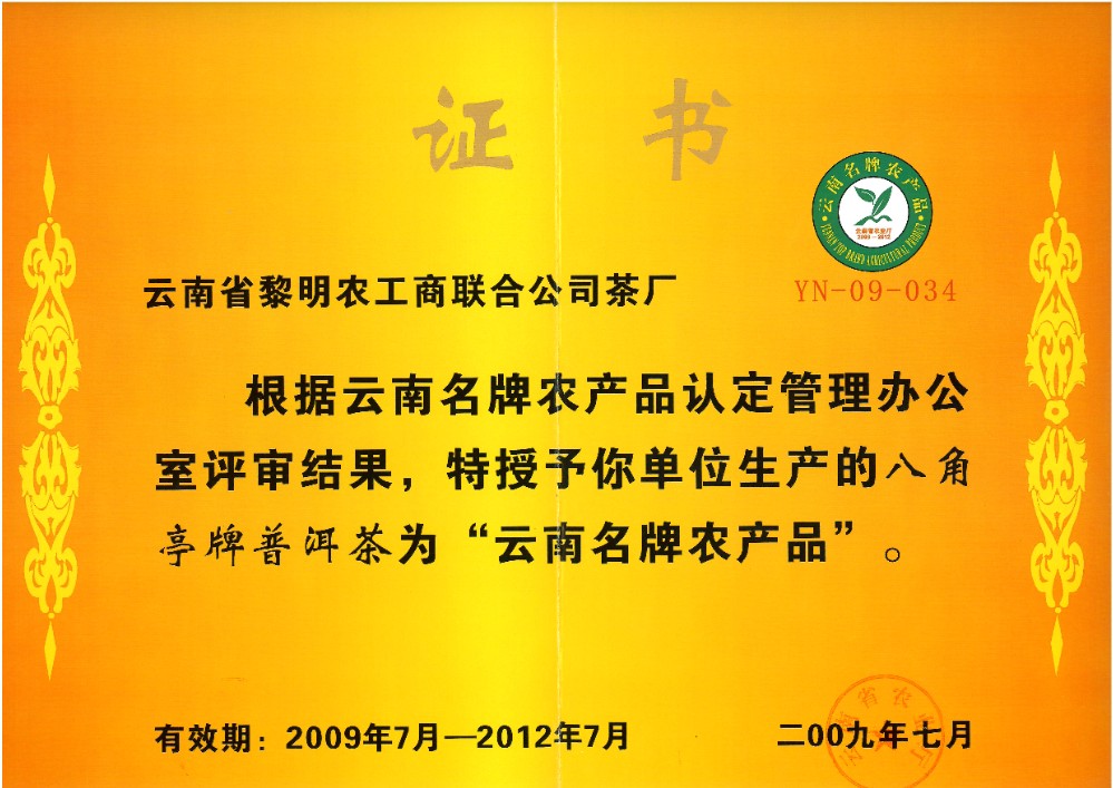 榮譽(yù)資質(zhì) 2009年云南名牌農(nóng)產(chǎn)品