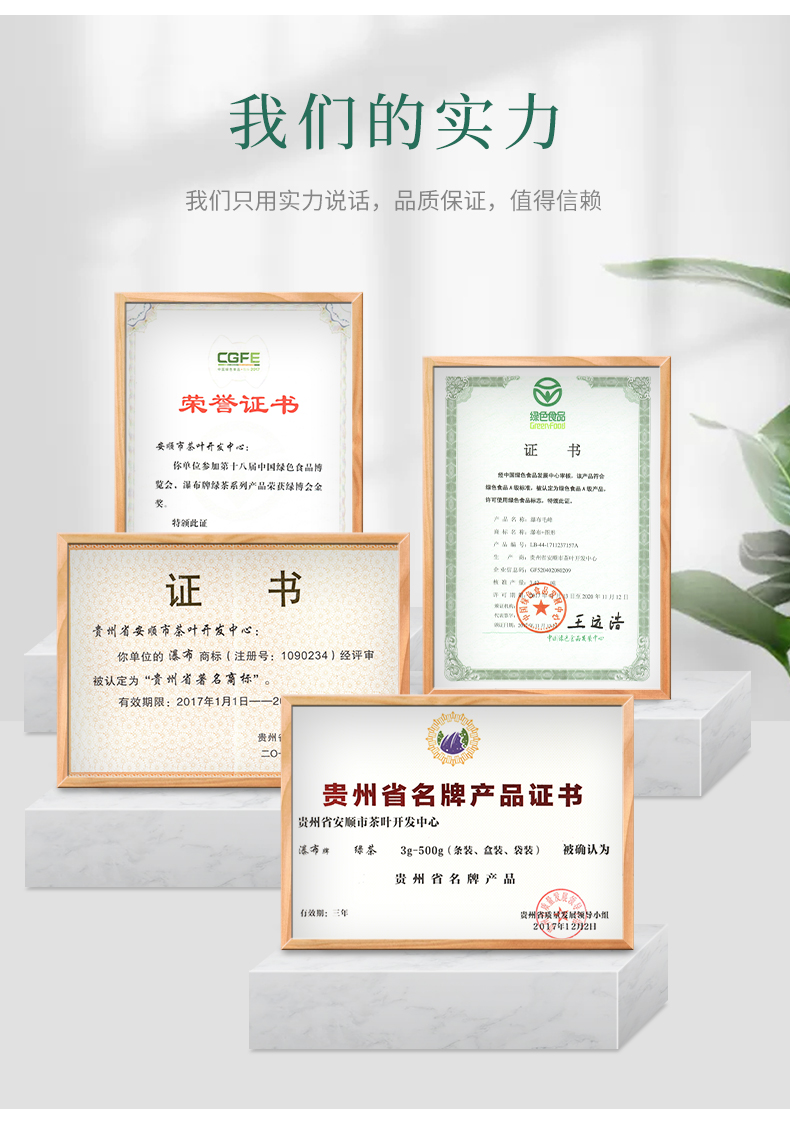瀑布茶品牌是安順市人民政府主打茶葉品牌,省級重點打造區(qū)域公共品牌,屬貴州五大名茶,先后獲得獲“中國農(nóng)產(chǎn)品區(qū)域公用品牌”、“貴州省著名商標(biāo)”、“貴州省名牌產(chǎn)品”等榮譽稱號。近年來,在各級部門大力推動下,瀑布茶品牌不斷發(fā)展壯大。截止目前,現(xiàn)有瀑布茶品牌加盟企業(yè)23家,輻射茶園面積200000余畝,其中綠色食品認(rèn)證茶園基地面積7000余畝,有機食品認(rèn)證基地面積2500畝。擁有“瀑布毛峰”、“瀑布翠芽”、“瀑布紅茶”、“瀑布翠龍”等產(chǎn)品,多次獲得“中綠杯”、“中茶杯”、“華茗杯”等大獎;分別榮獲第14屆中國國際農(nóng)產(chǎn)品交易會金獎、第18屆中國綠色食品博覽會金獎、“黃山杯”首屆全國傳統(tǒng)名茶產(chǎn)品質(zhì)量特別金獎、安順十大旅游商品等殊榮及稱號。