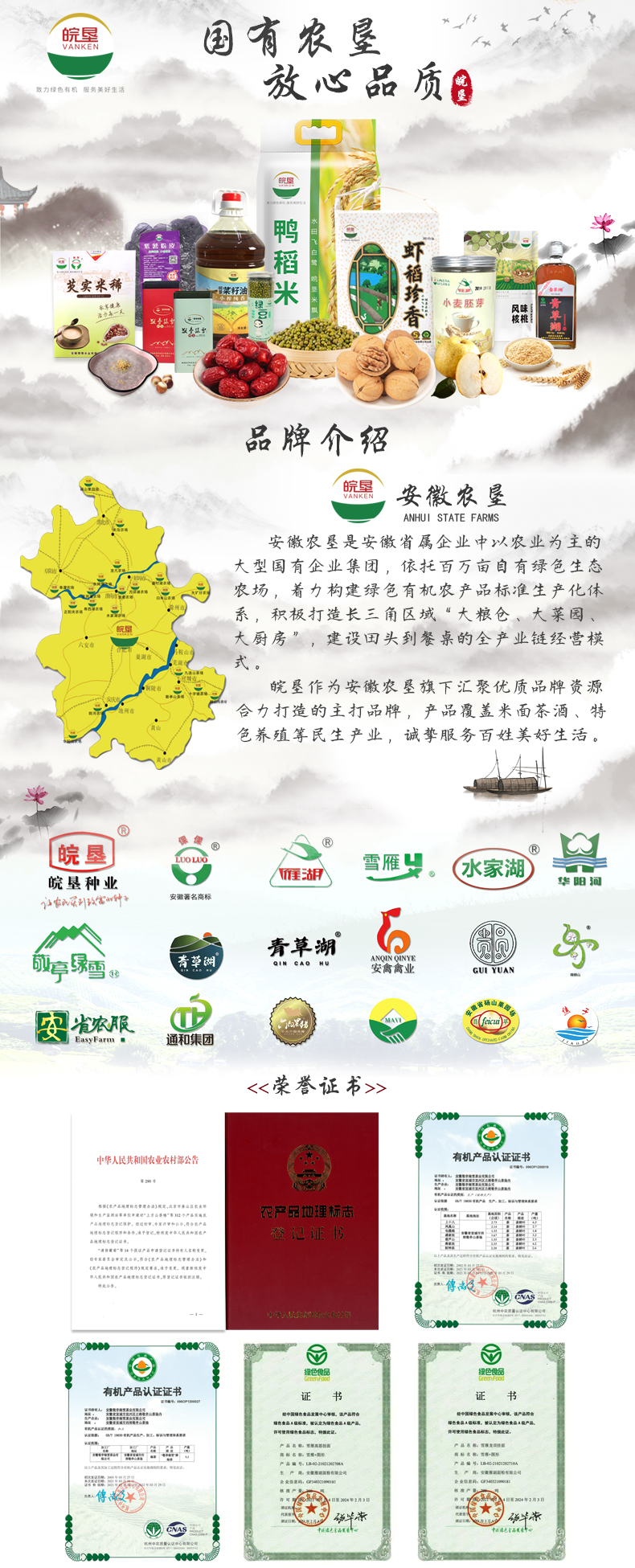 安徽省農墾集團有限公司是1998年經省政府批準由原省農墾農工商聯合總公司(前身為省農墾廳)改制成立的國有獨資公司,原由省委、省政府直接管理,2004年納入省國資委監管序列,與安徽省農墾事業管理局系一個機構、兩塊牌子、一套班子,系經濟建設與社會事業同步發展的綜合性系統。省農墾集團是安徽省規模最大的國有現代農業企業,2012年末,資產總額近70億(不含土地),下轄全資子公司42個,控股子公司36家,境外子公司1個;其中農、茶、果場20個,主要分布在皖南4個、沿江2個、沿淮及淮北14個,海外農場3個,土地面積7.5萬畝;專業公司6個、建筑公司1個。墾區總人口12.2萬人,其中,職工2.65萬人,離退休3萬人;擁有土地面積100萬畝,其中,耕地45萬畝,林地11.8萬畝,茶果園7萬畝,養殖水面1.5萬畝。墾區擁有農業科研所15個,科技人員2300多人。