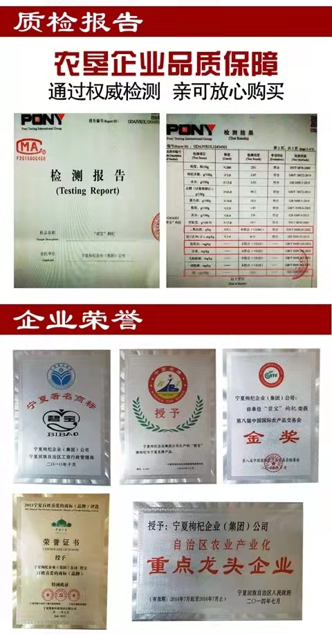 公司枸杞基地先后被國家、“全國農業標準化示范基地”,“自治區農業產業化重點龍頭企業”等稱號。是農業部質量追溯產品,并獲得中國農墾首批落地背書企業,產品通過了綠色食品認證、ISO9001質量管理體系認證,HACCP(危害分析與關鍵控制點)管理體系認證和GAP中國良好農業規范認證。公司主要產品為“碧寶牌” “南梁”牌枸杞。主導產品“碧寶牌” 多次獲得中國農業博覽會金獎、馬來西亞國際金獎、兩屆中國專利新技術新產品博覽會金獎在內的多項國際國內金獎,并連續獲得第十四屆、十五屆、十六屆國際農產品交易會金獎。